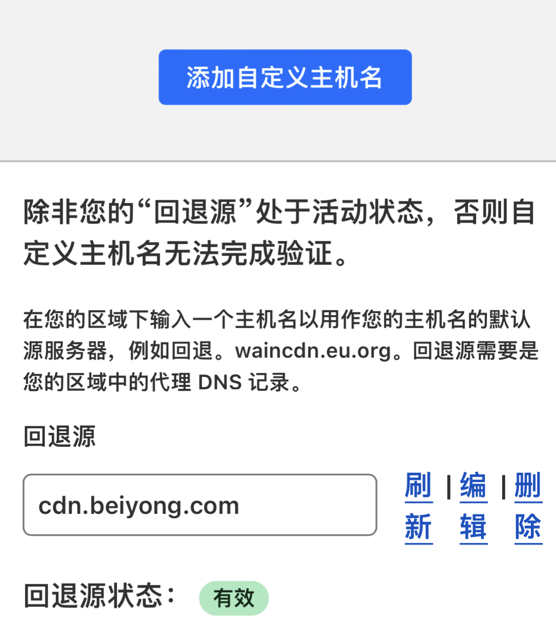 - 回退源填写上一步解析主机ip的自定义域名(cdn.beiyong.com)如果是固定ip也可直接填ip,然后点编辑保存